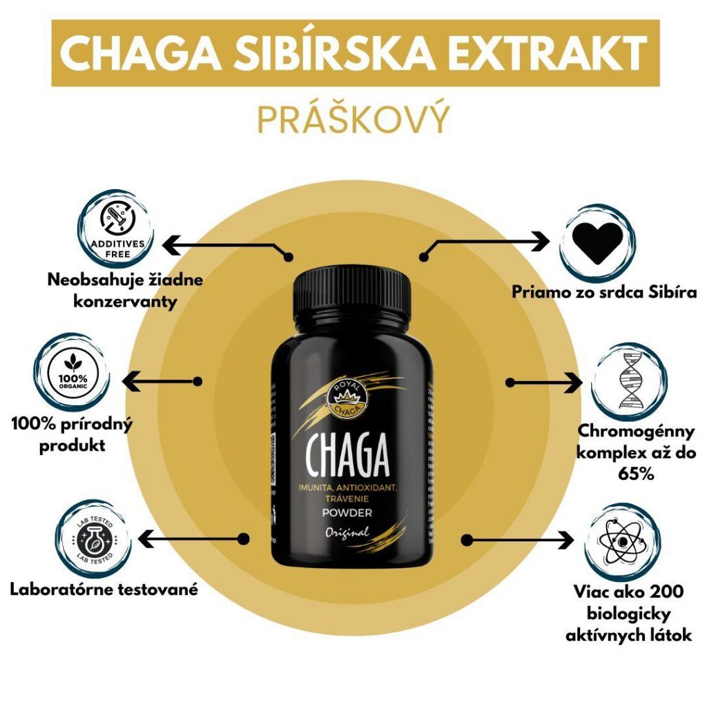 Čaga Sibírska, tiež známa ako "Kráľovná húb", je považovaná za jednu z najužitočnejších húb v Tradičnej Čínskej a Sibírskej Medicíne. Ide o parazitickú hubu, ktorá rastie najmä na brezových stromoch. Z nich čerpá živiny a ukladá ich vo svojej Plodnici až kým svojho hostiteľa nezabije. Vyznačuje sa vysokým obsahom Betulínu, Melanínu a Antioxidantov, ktoré sú pre telo veľmi prospešné. Je tiež bohatá na vitamíny a minerály, ktoré podporujú celkové zdravie organizmu.